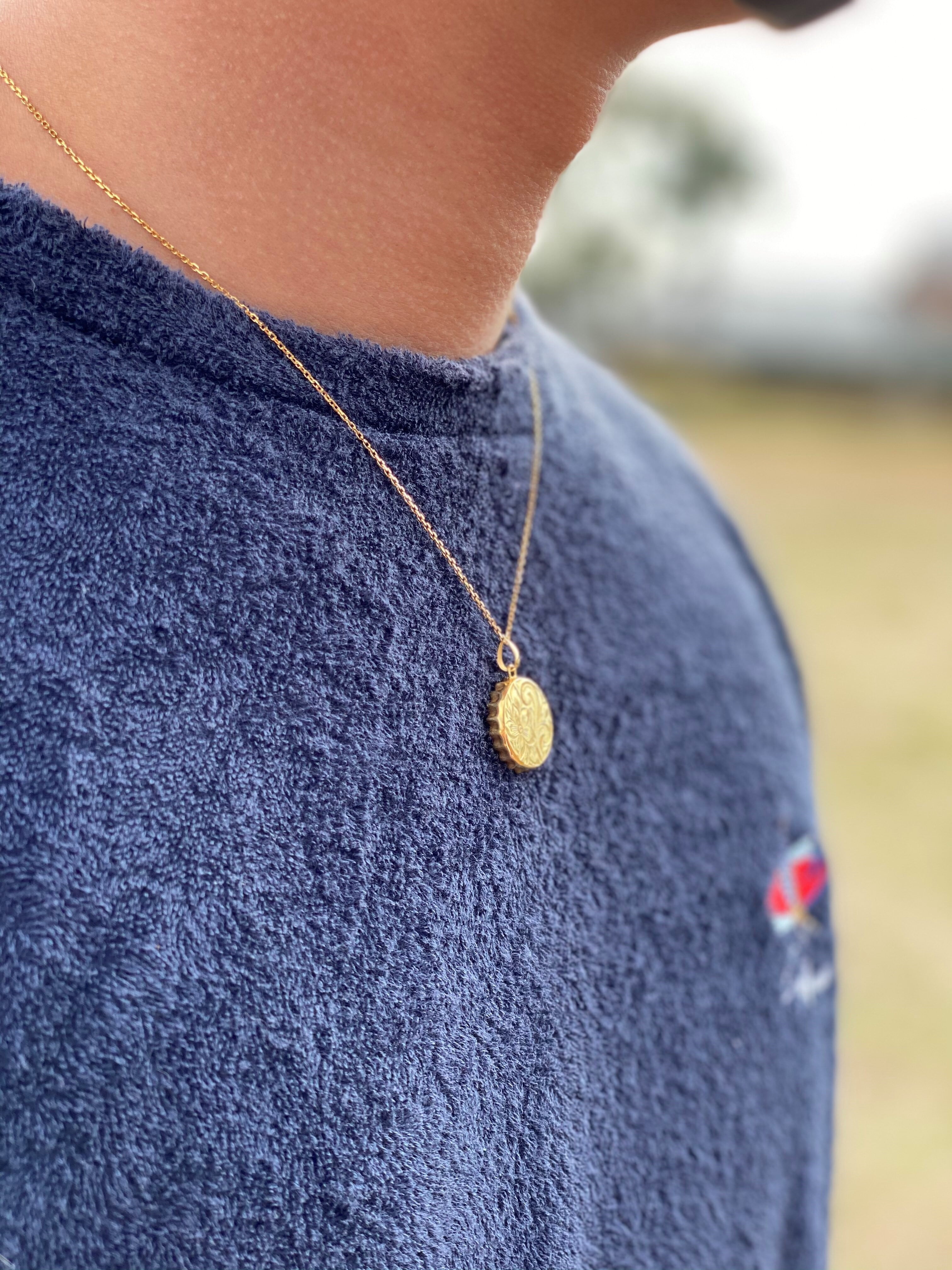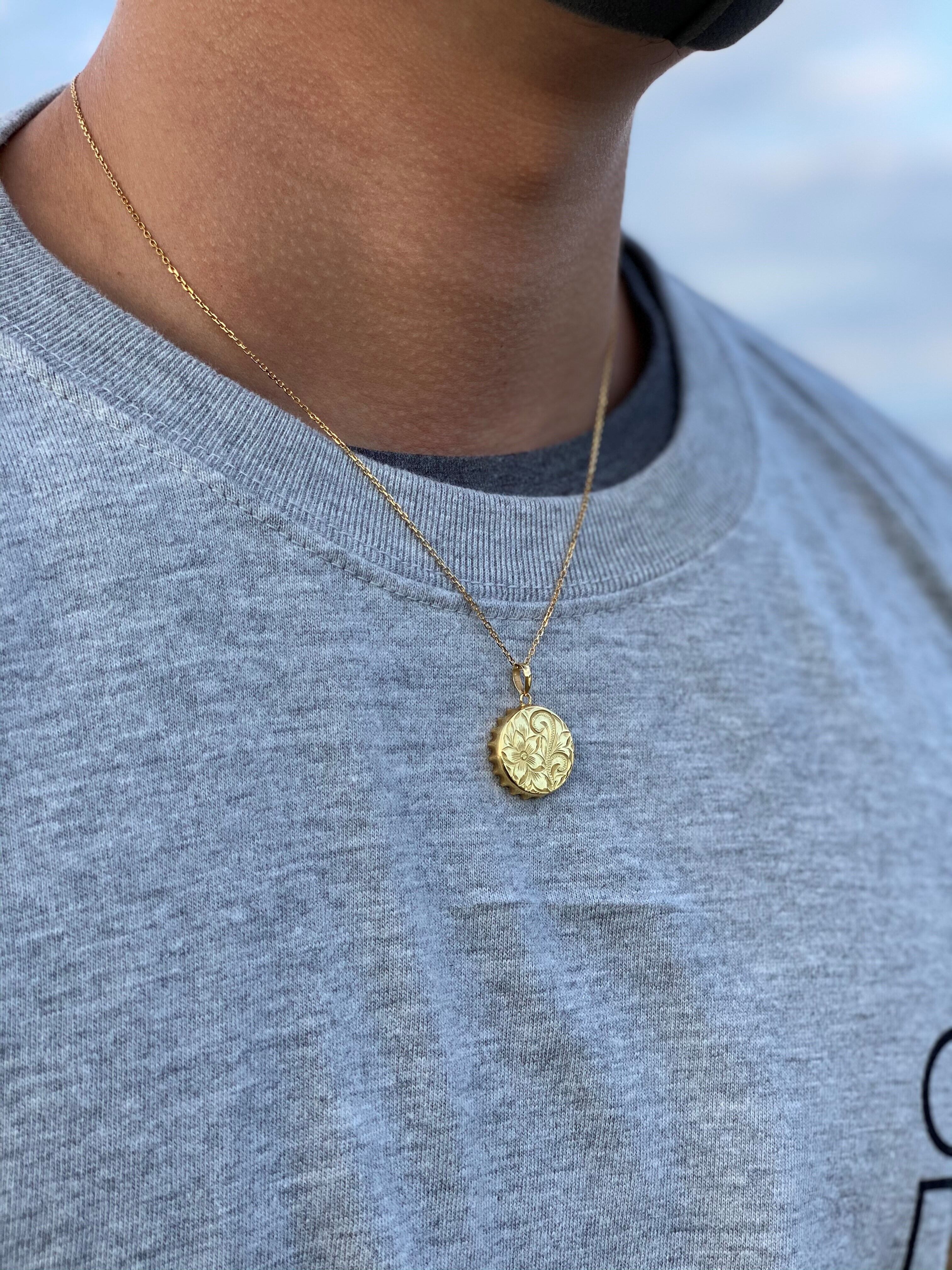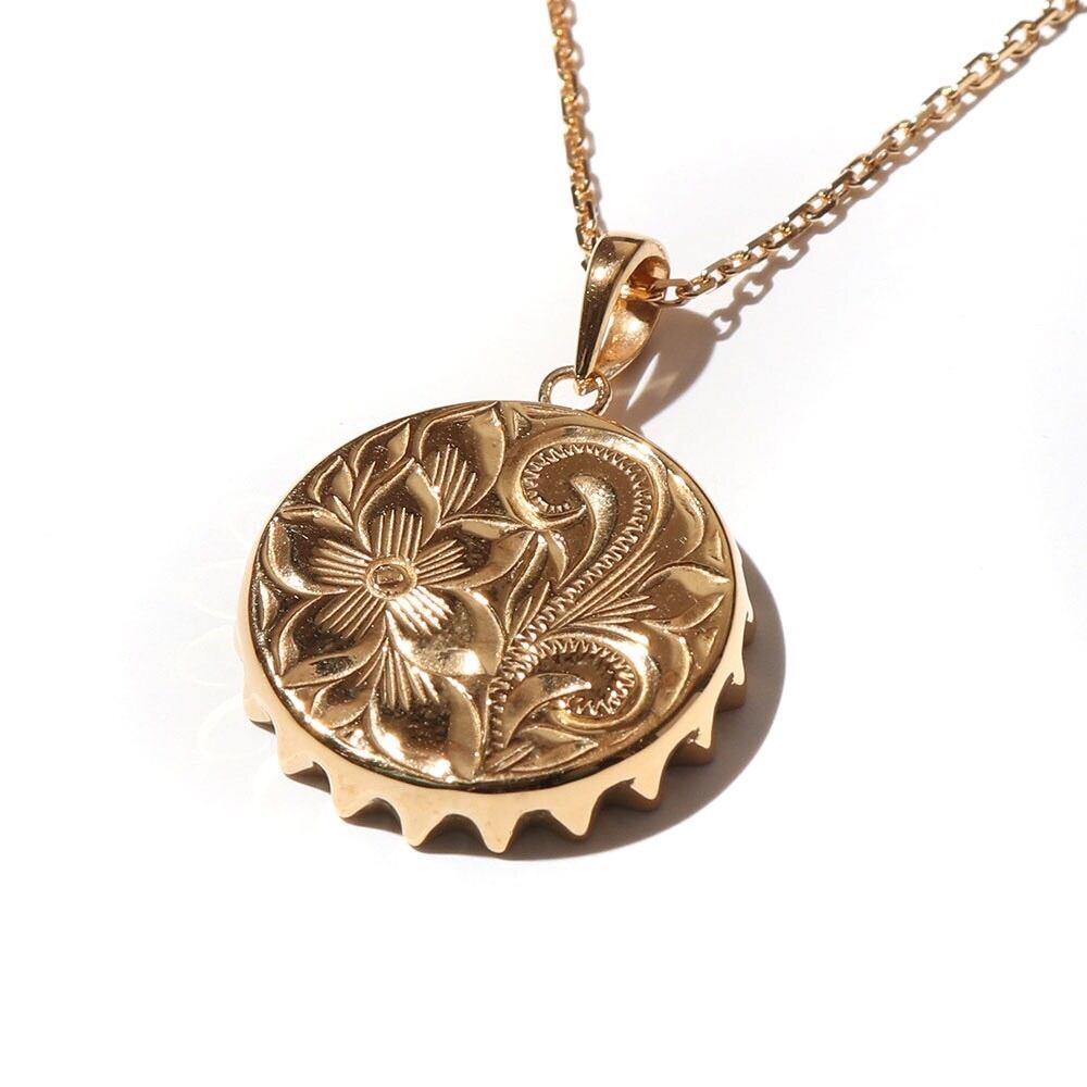 ハワイの砂浜に打ち上げられたボトルキャップをイメージし繊細なハワイアンジュエリーの彫刻を施したネックレス。