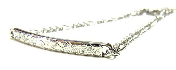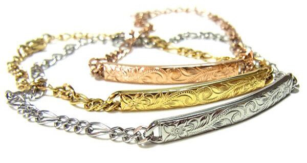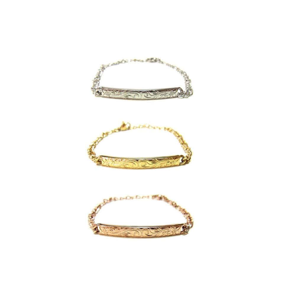 手首にフィットするように設計された形のプレートに人気のプルメリアとスクロールの彫刻を施したブレスレット。